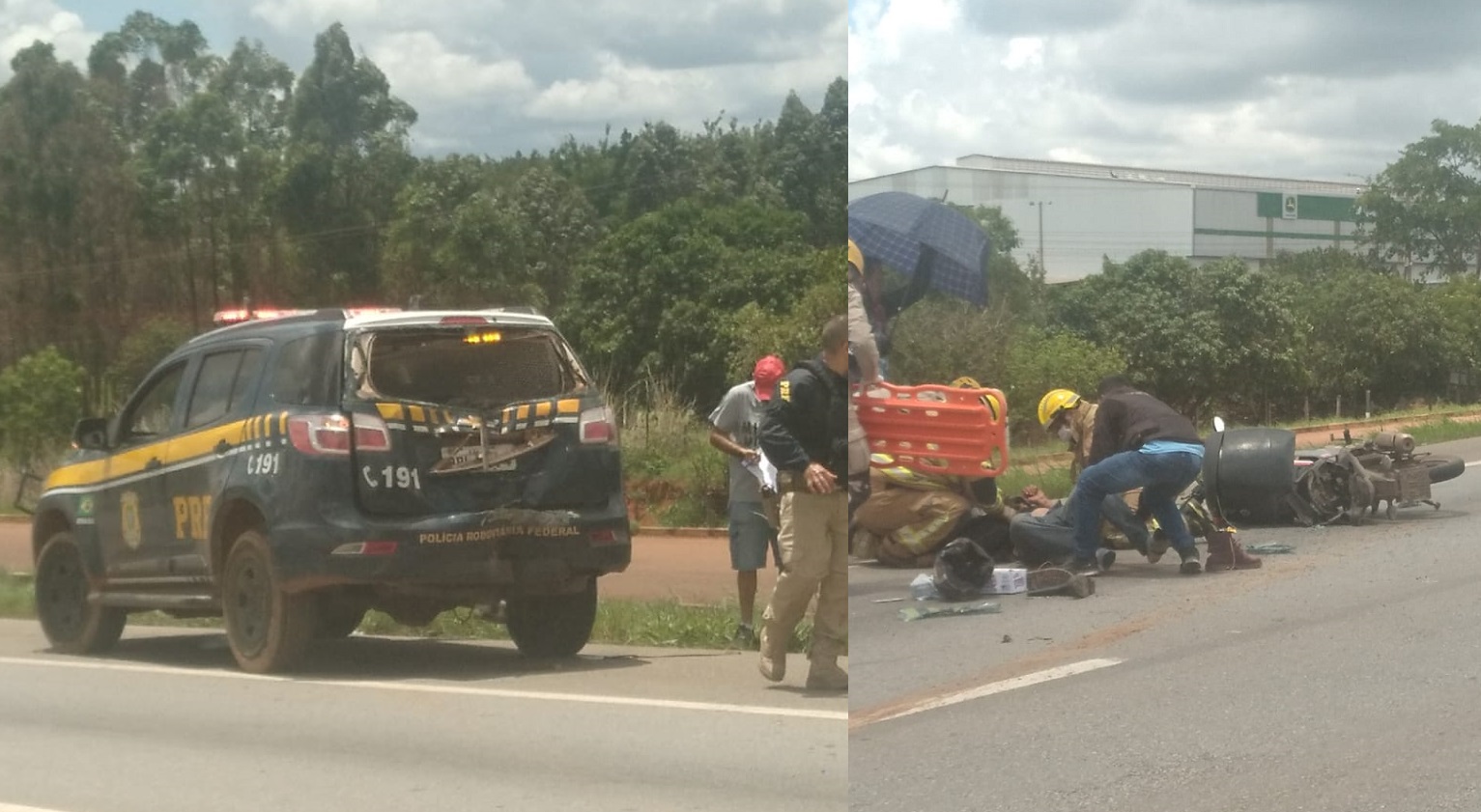 No fim da manhã deste sábado (27), por volta das 11hs, um motociclista colidiu na traseira de uma viatura da PRF no KM 17 da BR 070 DF, próximo a um galpão que comercializa maquinários agrícolas, chegando na divisa entre o DF e GO. De acordo com a PRF com o impacto e devido as escoriações o motociclista foi sorrido pelo helicóptero do SAMU. Não obtivemos informação sobre o que causou a colisão nem se houve mais feridos além do motociclista e nem sobre seu estado de saúde após o resgate. >> Imagem WhatsApp Radar